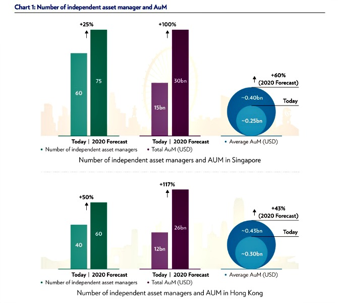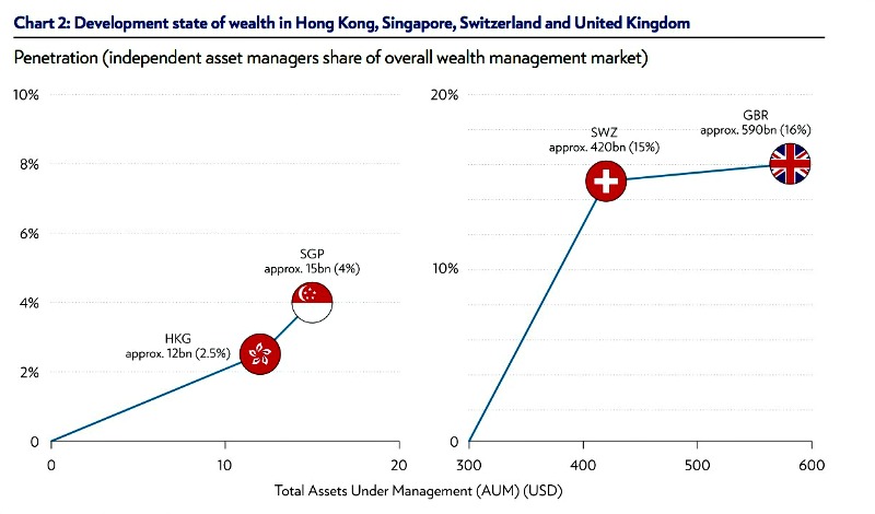 Die Autoren schätzen weiter, dass die unabhängigen Vermögensverwalter in Hongkong einen Marktanteil von 2,5 Prozent an den gesamten Private-Banking-Vermögen erreichen. In Singapur sind es rund 4 Prozent. Zum Vergleich: Unabhängige Vermögensverwalter in der Schweiz verwalten ein Kuchenstück von 15 Prozent aller geschätzten Vermögen im Wealth Management, wie die erste Grafik zeigt. Hongkong und Singapur haben also noch viel Potenzial.