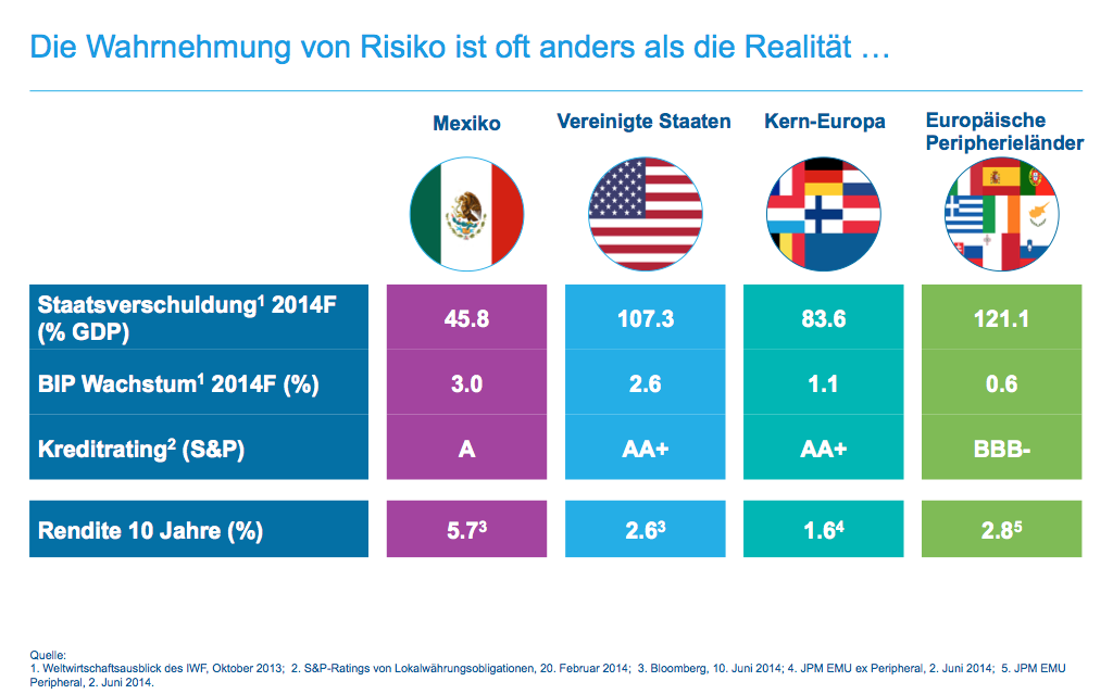 Gestützt werden diese Werte durch eine günstige demografische Entwicklung. In Deutschland beträgt das Durchschnittsalter der Bevölkerung 46 Jahre. In Brasilien und Mexiko sind es 31 respektive sogar nur 27 Jahre. Anders ausgedrückt: In den meisten Schwellenländern leben weitaus weniger alte Menschen, deren Renten und medizinische Versorgung aus der Staatskasse zu finanzieren sind.
