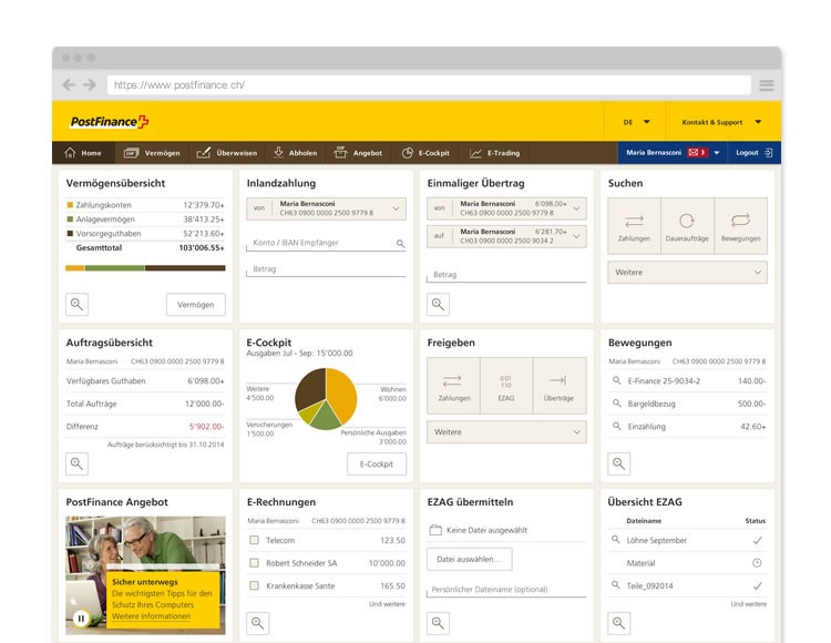 Mit dem E-Cockpit hat PostFinance vor zwei Jahren als erstes Finanzinstitut einen elektronischen Finanzassistenten im Onlinebanking lanciert. Mit den Erfahrungen und Erkenntnissen der letzten Monate wurde die Dienstleistung weiterentwickelt und ist nun ein fester Bestandteil von E-Finance.