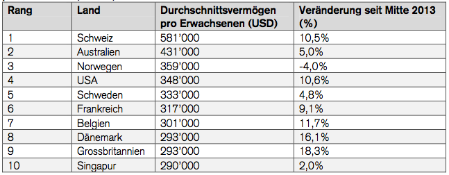 Interessant ist in diesem Zusammenhang weiter, dass allein in den vergangenen zwölf Monaten das Schweizer Durchschnittsvermögen um mehr als 10 Prozent zugenommen hat. Das ist vor allem auf die Aufwertung des Schweizer Franken gegenüber dem Dollar zurückzuführen.
