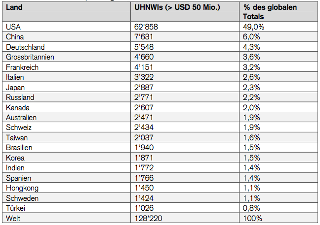 Mehr als die Hälfte der erwachsenen Schweizer Bevölkerung hat ein Vermögen von über 100'000 Dollar, und 11 Prozent oder 663'000 Personen sind Dollar-Millionäre. Rund 1'700 Personen in der Schweiz gelten als Ultra-High-Net-Worth-Individuals (UHNWI) mit Vermögen von mehr als 50 Millionen Dollar. Und gar 700 Personen in der Schweiz besitzen mehr als 100 Millionen Dollar.