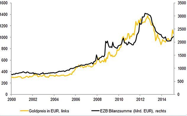 Der Rohstoffspezialist untermauert seine Euro-Prognose mit einer «bemerkenswert engen Korrelation» zwischen der Bilanzsumme der EZB und dem Goldpreis (siehe nachfolgenden Chart). «Geht man davon aus, dass die EZB ihre Bilanzsumme auf 3 Billionen Euro ausweiten wird, spricht das für ein Kursplus beim Gold von 10 Prozent auf Euro-Basis», sagt Weinberg.