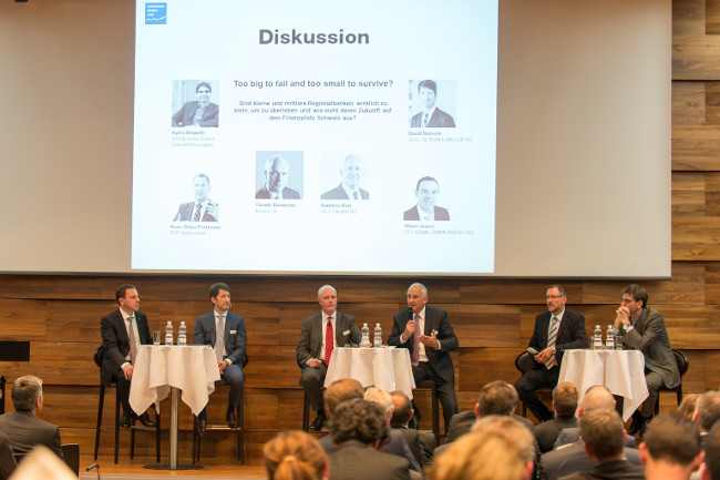 Im Anschluss daran diskutierten neben Sarasin und Jaussi noch Andreas Buri, CEO der Clientis AG, sowie FDP-Nationalrat Hans Peter Portmann und Professor Aymo Brunetti von der Universität Bern sowie Vorsitzender des Beirats «Zukunft Finanzplatz» über die Chancen und Risiken für kleine und mittelgrosse Banken. Moderiert wurde das Podium von Claude Baumann, Mitgründer und Chefredaktor von finews.ch.