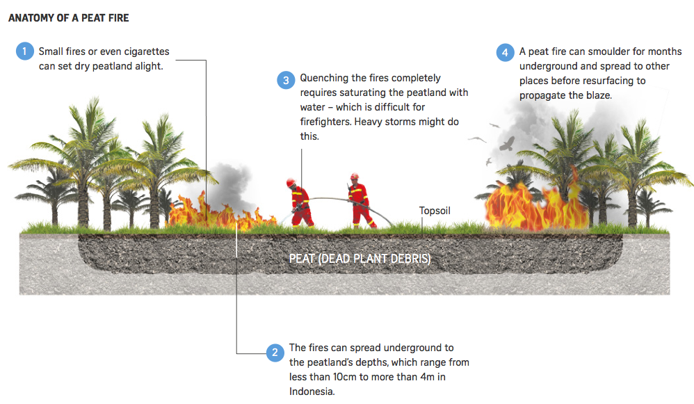 Das führt zu den erwähnten Rauchemissionen, die je nach Windrichtung sowohl Indonesien und Singapur, inzwischen aber auch Malaysia belasten. Hinzu kommt, dass die Feuer unter dem Boden weiter schwelen, so dass die Bekämpfung sehr schwierig ist.
