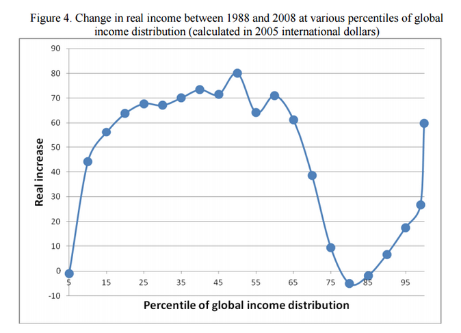 Der Chart, der einem Dickhäuter mit erhobenem Rüssel nachempfunden scheint (siehe Bild oben), zeigt nämlich, welche Einkommen am meisten von der Globalisierung zwischen 1988 und 2008 profitierten – und welche nicht.