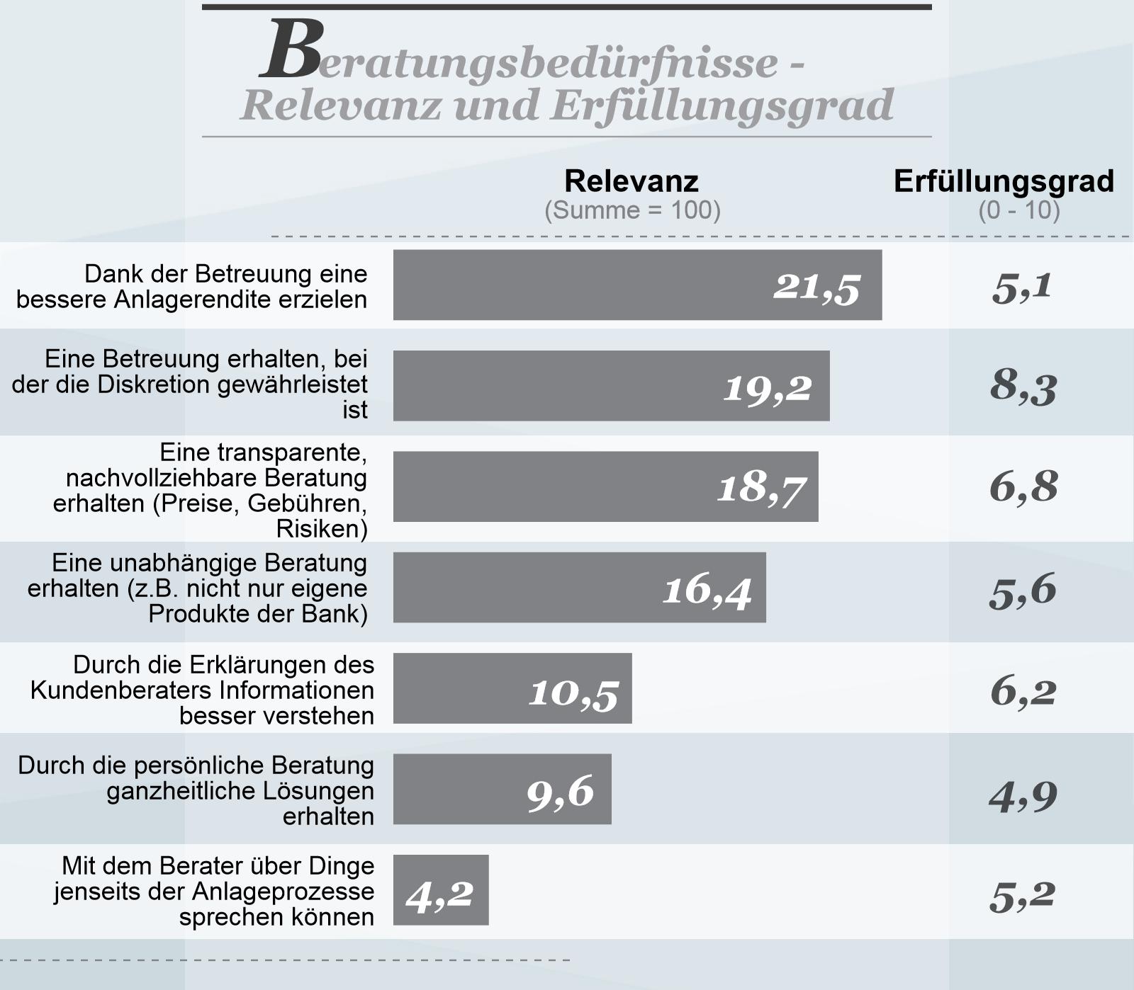 Überhaupt ist die Zufriedenheit mit der Beratung, trotz guter Beurteilungen hinsichtlich Bedürfnisverständnis, Sympathie und Kompetenz, deutlich ausbaufähig. Das gilt vorab auch für das Renditebedürfnis der Kunden: Der Wunsch nach einer besseren Anlagerendite durch eine kompetente Beratung bleibt vielen unerfüllt, obschon gerade dieser Punkt am wichtigsten ist.