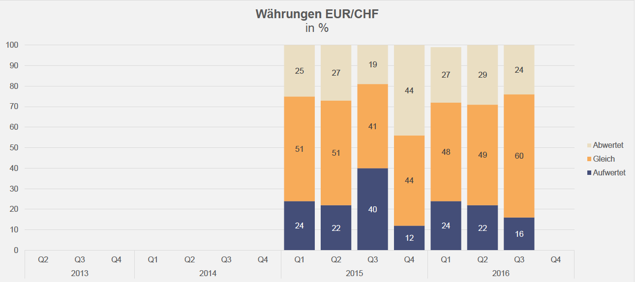 Bei den Währungen geht eine klare Mehrheit von 60 Prozent der befragten Vermögensverwalter (Vorquartal: 49 Prozent) von einem nunmehr stabilen Euro gegenüber dem Franken aus. Im Vergleich zum Dollar dürfte sich die europäische Einheitswährung allerdings weiter abschwächen, während das Verhältnis Dollar/Franken eher auf eine Aufwertung des «Greenback» hindeutet (vgl. nachfolgende Grafik).