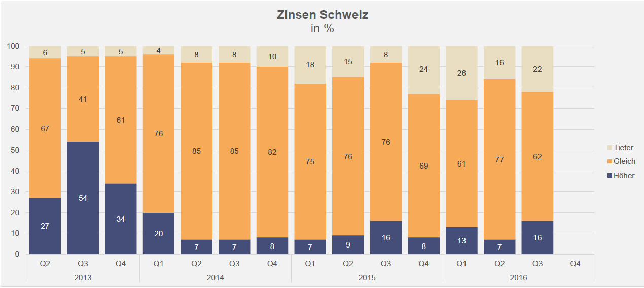 In der Schweiz gehen nur noch 62 Prozent der Befragten (Vorquartal: 77 Prozent) von gleichbleibenden Zinsen aus. Der Anteil jener Vermögensverwalter, die eine Veränderung erwarten, stieg in den vergangenen drei Monaten auf 38 Prozent (Vorquartal: 23 Prozent). Dabei deutet die Tendenz eher auf tiefere Zinsen hin (vgl. nachfolgende Grafik).