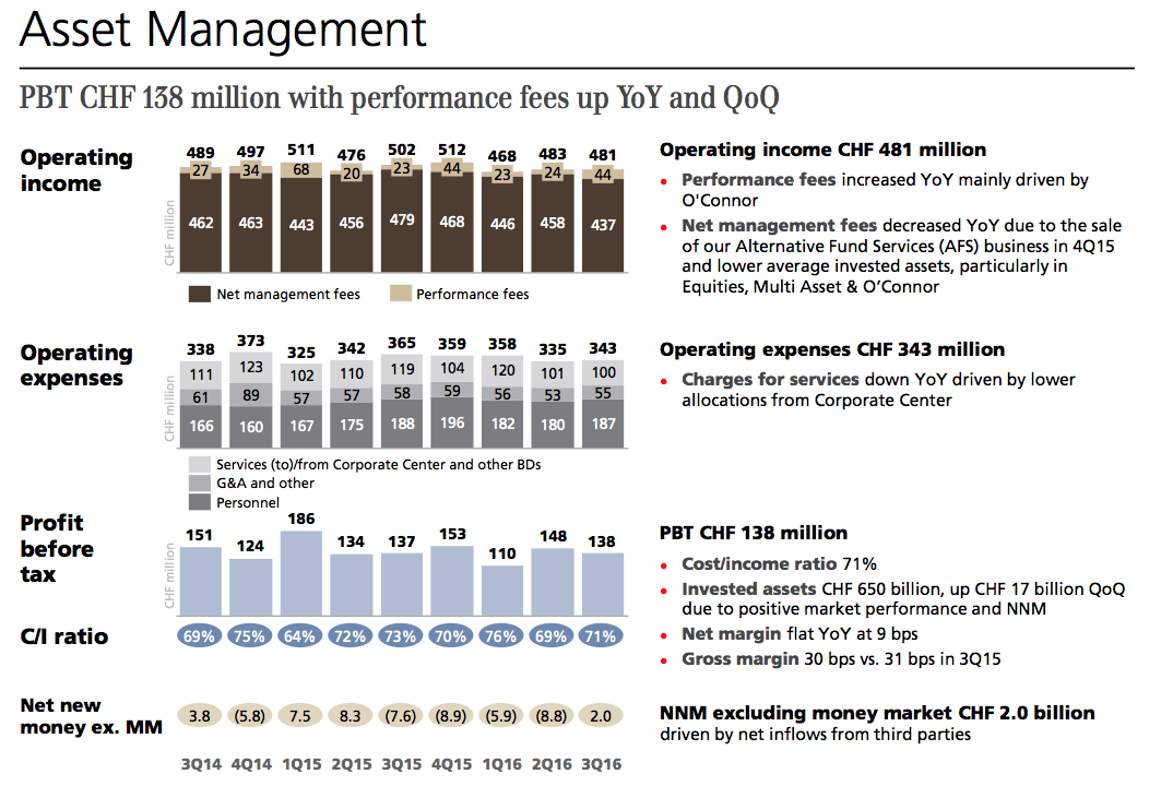 Zur Erinnerung: Bei seinem Antritt als Chef der Sparte im Jahr 2014 hatte Ulrich Körner erklärt, die Division müsse dereinst eine Milliarde Franken verdienen. Ende 2015 hatte das Asset Management dann gut 600 Millionen Franken Gewinn ausgewiesen. Doch heuer, also bis Ende Dezember, deutet herzlich wenig hin, dass dieser Wert übertroffen wird (vgl. obige Grafik).