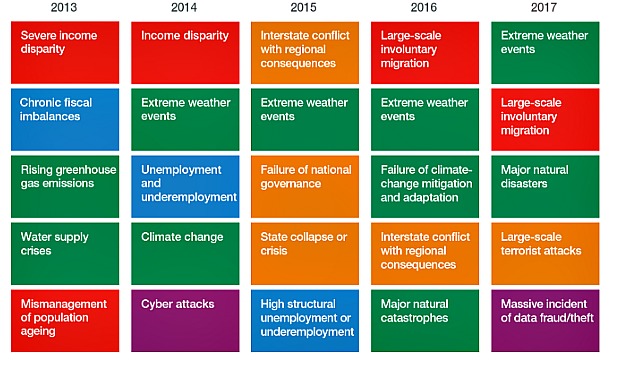 Seit zehn Jahren werden im «Global Risks Report» die fünf grössten globalen Risiken genannt. Dieses Jahr hat das WEF Jahr eine Übersicht geschaffen, wie sich die Wahrnehmung verändert hat. Erstmals überhaupt bezeichnen die Auguren den Terrorismus als globales Risiko.