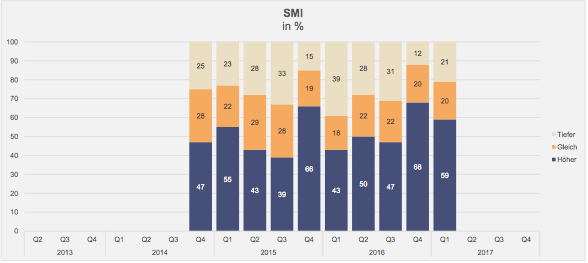 Angesichts der neuen Ausgangslage rechnen mittlerweile mehr als 20 Prozent der befragten Vermögensverwalter in den kommenden drei Monaten mit sinkenden Kursen im Swiss Market Index (SMI). Ende September waren es erst 12 Prozent gewesen (vgl. Grafik).