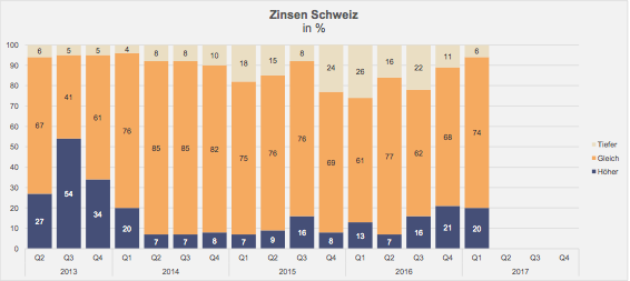 In der Schweiz gehen jetzt 74 Prozent der Befragten (Vorquartal: 68 Prozent) von gleichbleibenden Zinsen aus. Der Anteil jener Vermögensverwalter, die tiefere Zinsen erwarten, ist auf 6 Prozent (Vorquartal: 11 Prozent) gesunken. Nur noch 20 Prozent der Vermögensverwalter erwarten höhere Zinsen, nach 21 Prozent im Vorquartal (vgl. nachfolgende Grafik).