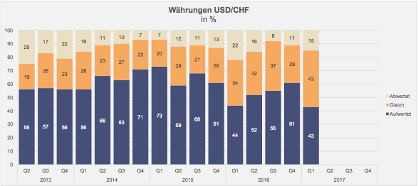 Bei den Währungen geht eine Mehrheit von 56 Prozent der befragten Vermögensverwalter (Vorquartal: 63 Prozent) von einem stabilen Euro gegenüber dem Franken aus. Im Vergleich zum Dollar dürfte sich die europäische Einheitswährung abschwächen, während das Verhältnis Dollar/Franken eher auf eine Stagnation zum «Greenback» hindeutet (vgl. nachfolgende Grafik).