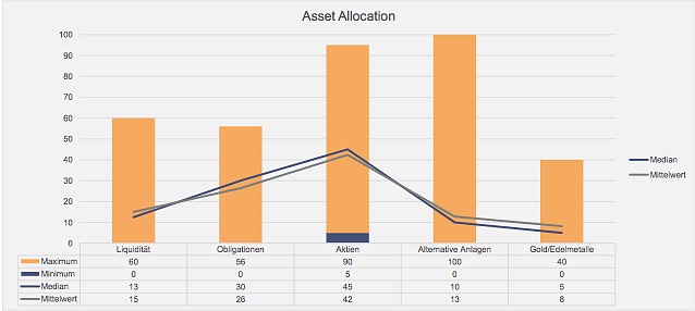 Alternative Anlagen liegen unverändert bei 10 Prozent, während der Anteil an Gold und anderen Edelmetallen 5 Prozent (unverändert) beträgt, wie der AVI-Umfrage weiter zu entnehmen ist.