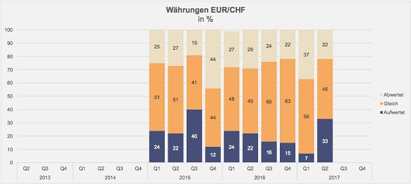 Bei den Währungen erwartet nun ein Drittel der Befragten einen stärkeren Euro gegenüber dem Franken (vgl. nachfolgende Grafik). Im Vorquartal waren es erst 7 Prozent gewesen.