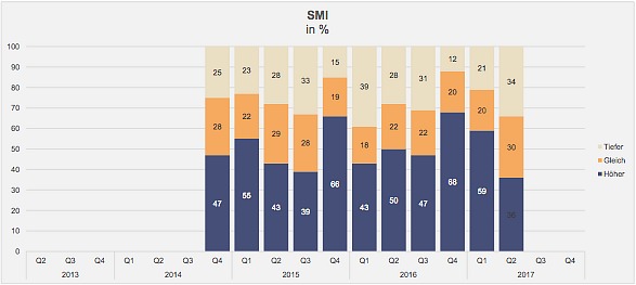 Angesichts der neuen Ausgangslage rechnet mittlerweile gut ein Drittel der befragten Vermögensverwalter in den kommenden drei Monaten mit sinkenden Kursen im Swiss Market Index (SMI). Ende März waren es erst 21 Prozent gewesen (vgl. nachfolgende Grafik).