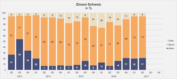 In der Schweiz gehen jetzt 73 Prozent der Befragten (Vorquartal: 74 Prozent) von gleichbleibenden Zinsen aus. Der Anteil jener Vermögensverwalter, die tiefere Zinsen erwarten, ist auf 6 Prozent (Vorquartal: unverändert) gesunken. Nur noch 21 Prozent der Vermögensverwalter erwarten höhere Zinsen, nach 20 Prozent im Vorquartal (vgl. nachfolgende Grafik).