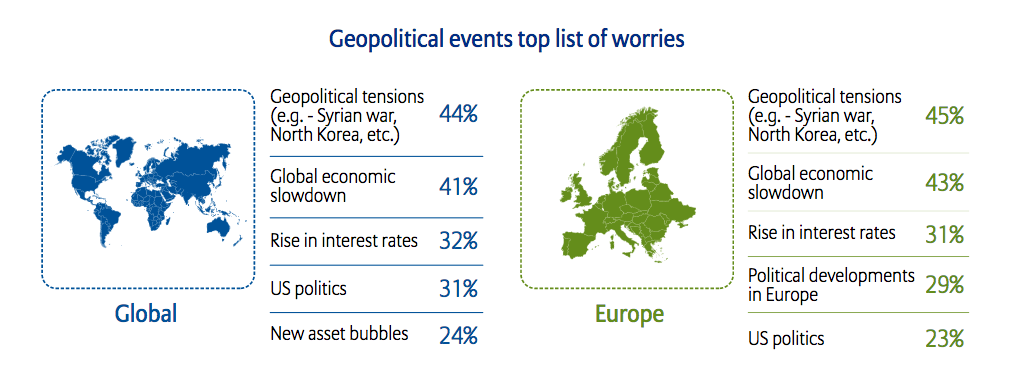 Als grösste Herausforderung schätzen institutionelle Investoren erstmals geopolitische Spannungen (44 Prozent der Befragten) ein, gefolgt von Sorgen vor einer Abschwächung der globalen Konjunktur (41 Prozent) und steigenden Zinsen (32 Prozent).