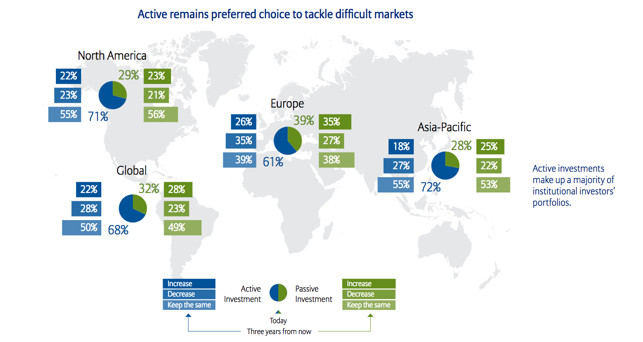 Die logische Folgerung davon ist, aktiven Investments den Vorzug zu geben; 63 der europäischen Studienteilnehmer kamen zu Schluss, dass die Bedeutung dieser (aktiven) Finanzprodukte bis 2020 deutlich zunehmen wird. Auf dem Kontinent werden laut der Erhebung 61 Prozent der institutionellen Vermögen noch immer aktiv verwaltet. Ein Viertel der Befragten gab an, diesen Anteil künftig zu erhöhen (siehe Grafik unten).