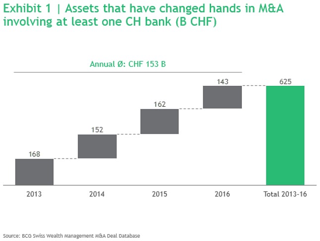 Seit der Finanzkrise kämpfen die Banken mit sinkenden Margen, zunehmender Konkurrenz und wachsenden Regulationskosten. Die Konsequenz: Konsolidierung. Zwischen 2013 und 2016 sind Vermögenswerte von mehr als 625 Milliarden Franken in die Hände anderer Finanzinstitute übergegangen, in der mindestens eine Partei eine Schweizer Bank war. Dies geht aus einer Studie des Beratungsunternehmens Boston Consulting Group (BCG) hervor (siehe Grafik).