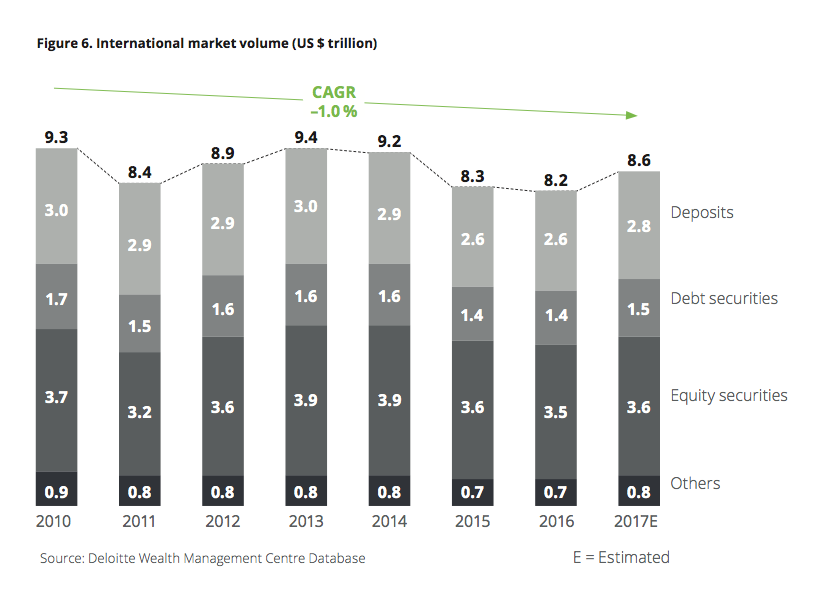 Geht man davon aus, dass die langjährige Hausse an den Börsen ihrem Ende entgegengeht, dann akzentuiert sich das Wachstumsproblem der Schweizer Vermögensverwalter noch zusätzlich. Das Finanzzentrum ist heute schon exponiert. Während alle wichtigen ausländischen Konkurrenten 2017 Neugelder anziehen konnten, war der Saldo für den Schweizer Finanzplatz negativ, so Deloitte.