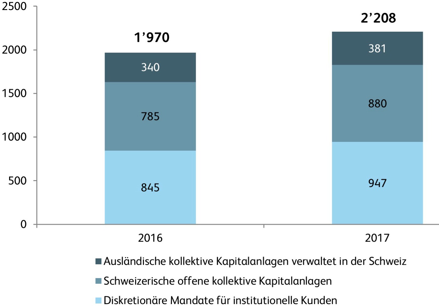 Dabei handelt sich um die Vermögen, die durch Asset-Management Firmen-in der Schweiz für in- und ausländische Kunden verwaltet werden. Davon entfielen 1‘261 Milliarden Franken auf kollektive Kapitalanlagen und 947 Milliarden Franken auf institutionelle Mandate. Die Zahlen beruhen auf den Daten von 32 Teilnehmern, die rund 80 Prozent des Gesamtmarktes repräsentieren, sowie der Hochrechnung dieser Daten.