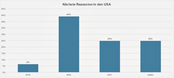 Die schwierigste Zeit an den Finanzmärkten dürfte erst im nächsten Jahr, also 2020, eintreten. Davon sind mittlerweile 44 Prozent der unabhängigen Vermögensverwalter in der Schweiz überzeugt (vgl. Grafik unten). Sie gehen davon aus, dass sich der anhaltende Handelskrieg zwischen den USA und China (41 Prozent der Befragten) zwar nicht verschärfen wird, aber zu einer Art Patt-Situation führen dürfte, die sich mittelfristig negativ auf die Börse auswirkt.