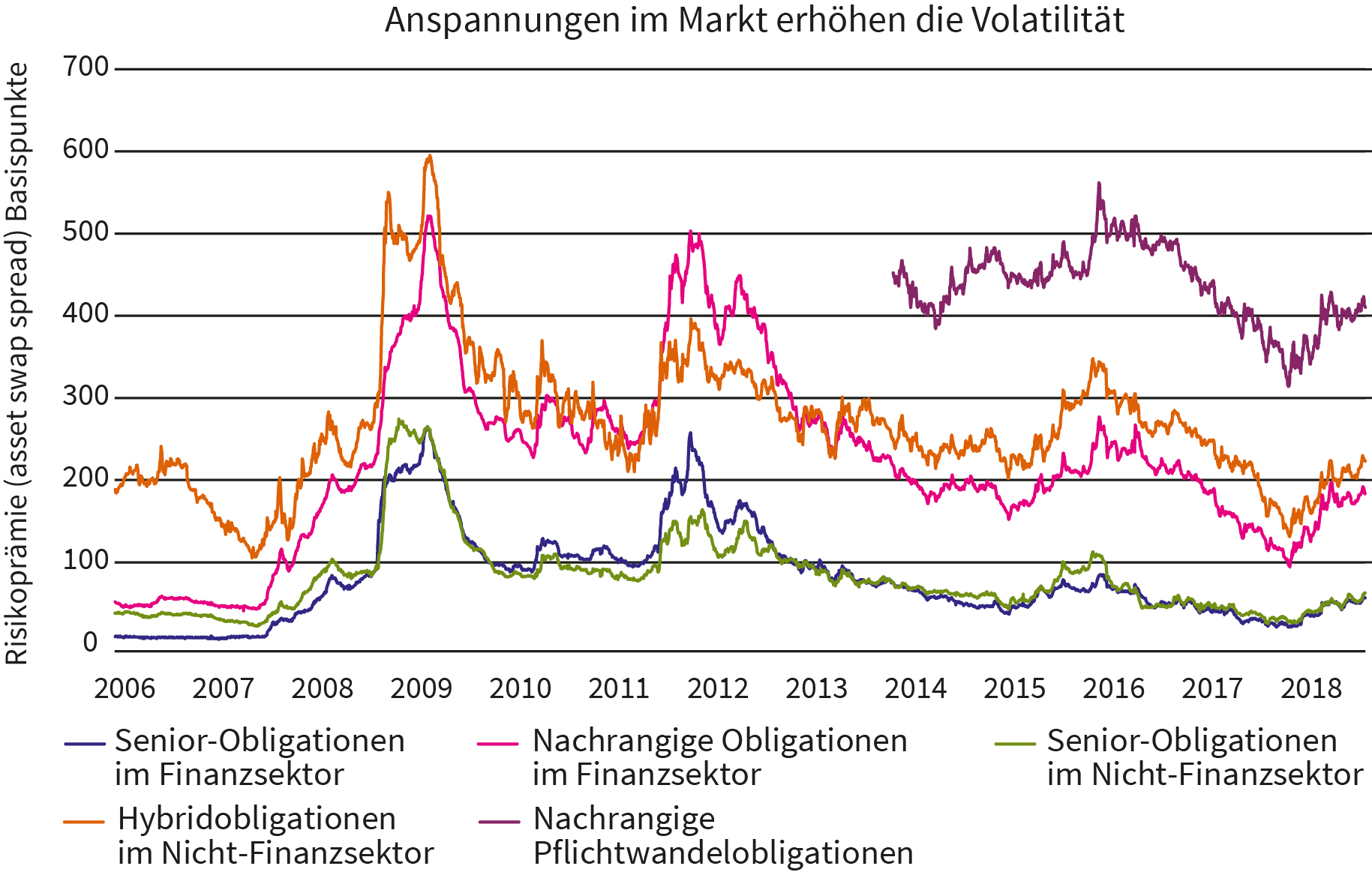 Da sie höhere mögliche Risiken schultern, werden nachrangige Obligationen mit einer hohen Korrelation zum Beta eines Unternehmens gehandelt. Trotzdem haben Investoren nicht immer zwischen den fundamentalen Stärken der Emittenten unterschieden, auch nicht in Zeiten erhöhter Spannungen im Markt wie zum Beispiel 2008/09 und 2011/12. In diesen Phasen – und auch während der Rohstoffkrise 2015/16 – war die Volatilität nachrangiger Obligationen besonders hoch (siehe Grafik).