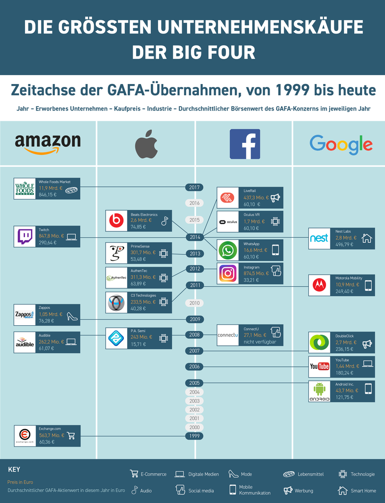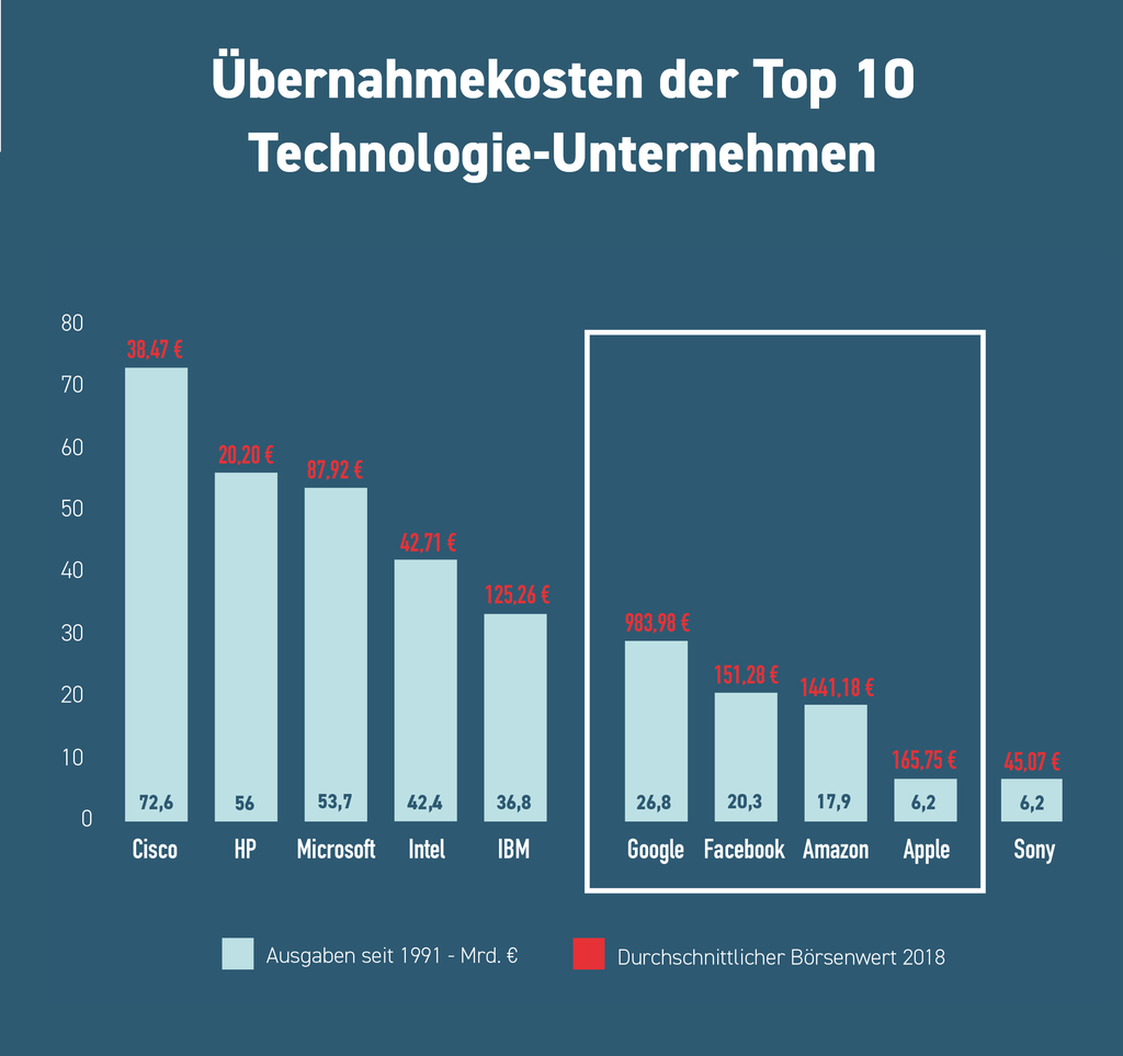 Vergleichsweise ist Google am ausgabefreudigsten und hat seit seiner Gründung 26,8 Milliarden Euro in Firmenübernahmen investiert.