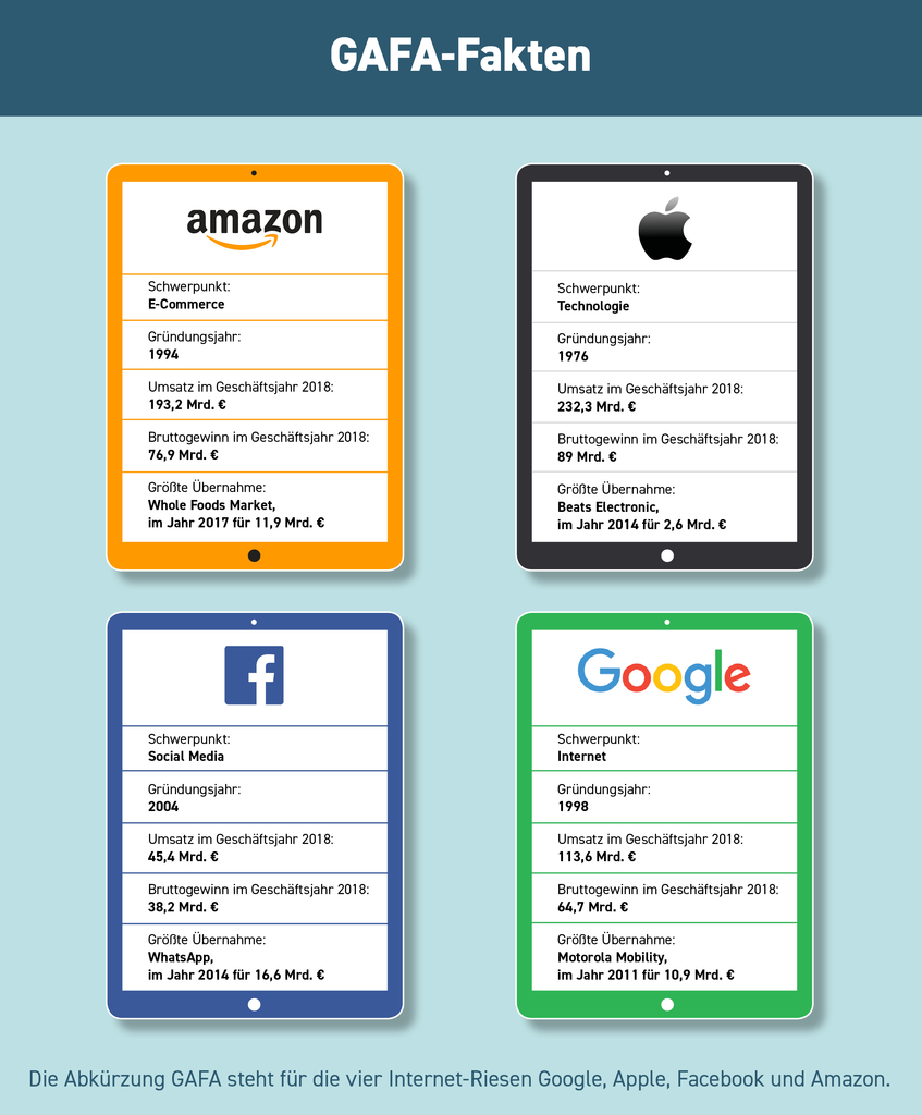 Die Stärke der GAFA-Konzerne zeigt sich bereits beim Blick auf die Zahlen. So hatte Apple als grösster Konzern im Geschäftsjahr 2018 einen Jahresumsatz von 232,3 Milliarden Euro und erwirtschaftete 89 Milliarden Euro Bruttogewinn.