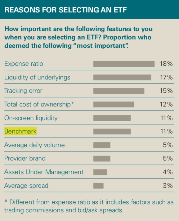 Bei der Auswahl verlassen sich die Käufer dieser Finanzprodukte allerdings mit Vorliebe auf messbare Kriterien. In einer Studie von 400 ETF-Käufern, durchgeführt vom US-Vermögensverwalter Vanguard, entpuppen sich die Kosten als wichtigstes Unterscheidungsmerkmal: Knapp jeder fünfte der Befragten wählte diese Option.
