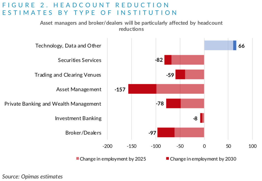 Am härtesten trifft der Abbau den Asset-Management-Bereich. Opimas erklärt das Ergebnis mit einem Zusammenspiel aus mehreren Gründen: «Erstens konzentriert man sich zunehmend auf quantitative Anlagestrategien, die sich auf KI und maschinelles Lernen stützen und nicht auf traditionelle Analysen.»