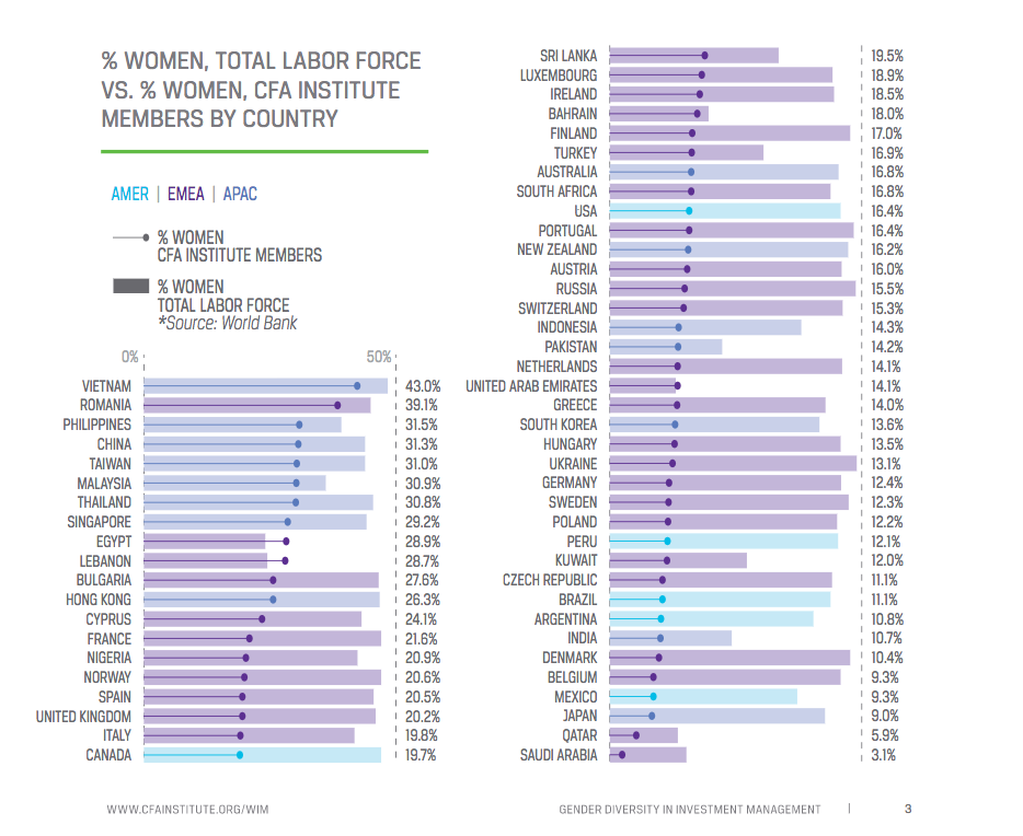 Mit der Wahl setzt die Organisation nun ein Signal für Gleichberechtigung in einer Branche, in der Frauen in Führungspositionen chronisch untervertreten sind. Allerdings besteht auch beim CFA Institute diesbezüglich noch Aufholbedarf, wie eine Erhebung von 2016 zeigte: In keinem Land der Welt stellten damals Frauen die Hälfte der jeweiligen CFA-Alumni (siehe Grafik unten).
