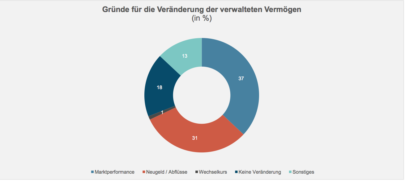 Ein Blick zurück zeigt zudem, dass die ersten neun Monate 2019 positive Spuren in den Büchern der unabhängigen Vermögensverwalter hinterlassen haben. Die anziehenden Kurse zwischen Januar und Ende September führten nicht nur zu einer Steigerung der verwalteten Vermögen bei 57 Prozent der Befragten, sondern auch zu einem deutlichen Zuwachs an Neugeld bei 31 Prozent der Umfrageteilnehmer. Die gute Marktperformance war für 37 Prozent der Vermögensverwalter ebenfalls wichtig für das Wachstum (vgl. Grafik).