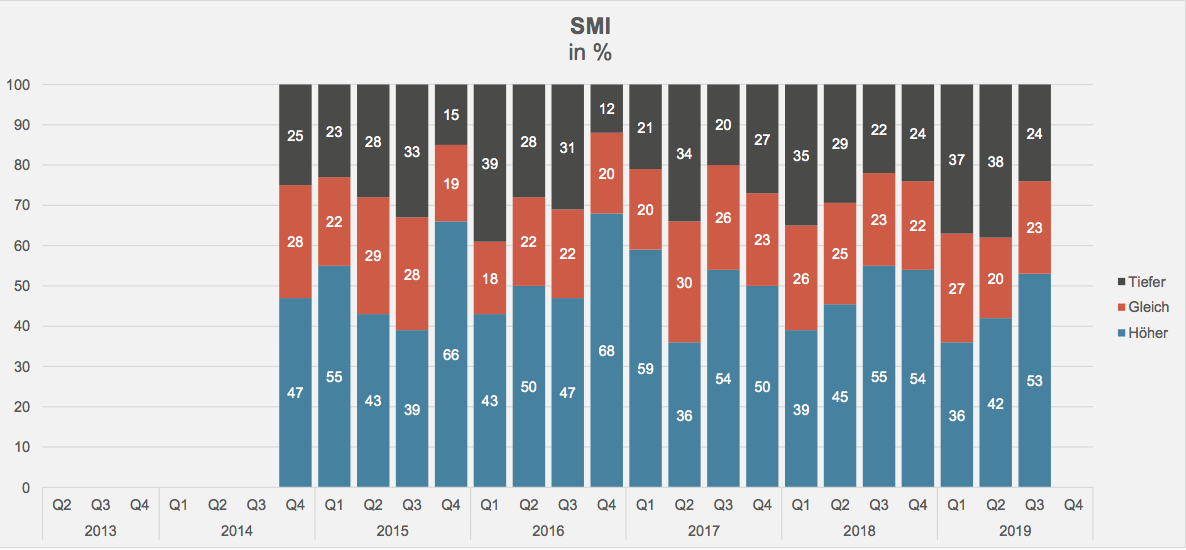 Vor diesem Hintergrund überrascht es nicht, dass die Schweizer Vermögensverwalter für die nächsten drei Monate von deutlich steigenden Börsenkursen (im SMI 53 Prozent der Befragten, im EuroStoxx50 43 Prozent sowie im S&P500 47 Prozent) ausgehen (vgl. Grafik).