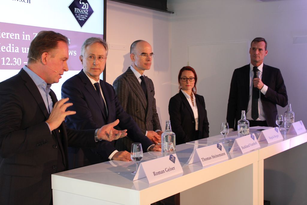 Auf grosses Interesse stiess die von finews.ch veranstaltete Diskussion zum Thema «Investieren in Zeiten von Social Media und Fake News» mit Roman Geiser, Thomas Steinemann, Burkhard Varnholt und Regula Berger – Moderator war finews.ch-Chefredaktor Peter Hody (von links im Bild oben).