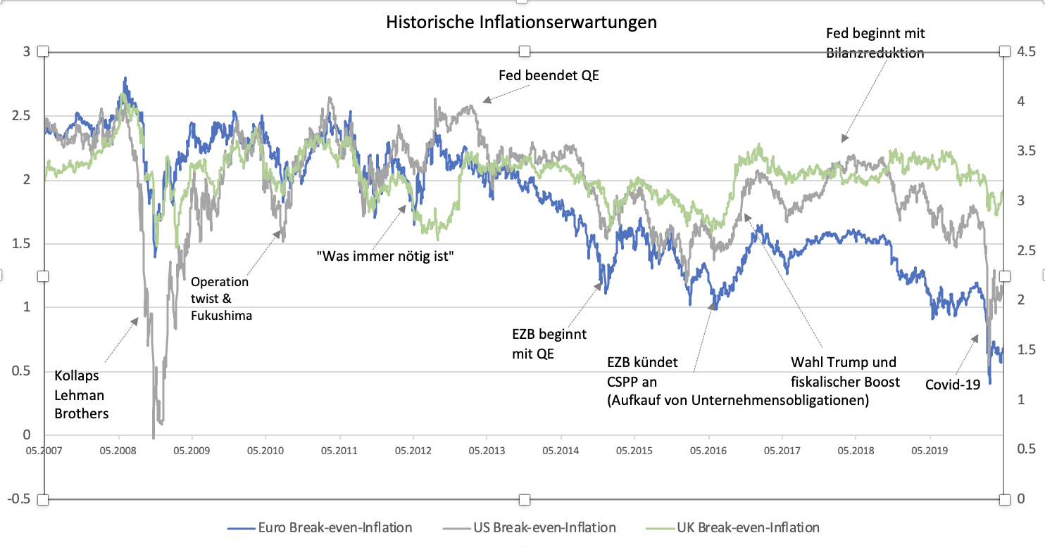 Es stellt sich eher die Frage, ob die Gefahr einer Deflation droht. Als Folge der internationalen Finanz- und Staatsschuldenkrise vor rund zehn Jahren wurden vor allem in Europa umfangreiche Sparpakete umgesetzt; eine suboptimale Massnahme, da somit verschiedenen Länder unter ihrem Potenzialwachstum blieben und deflationäre Tendenzen aufwiesen. Für dieses Jahr preisen die Märkte wegen dem Ölpreissturz äusserst geringe oder gar negative Inflationserwartungen ein.