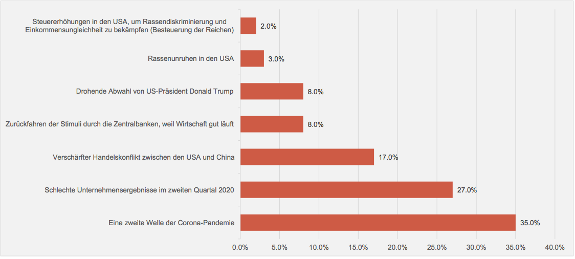 Dazu gehören eine neue Corona-Welle, enttäuschende Unternehmensergebnisse aus dem zweiten Quartal 2020 sowie ein anhaltender Handelskonflikt zwischen den USA und China (vgl. nachfolgende Grafik).