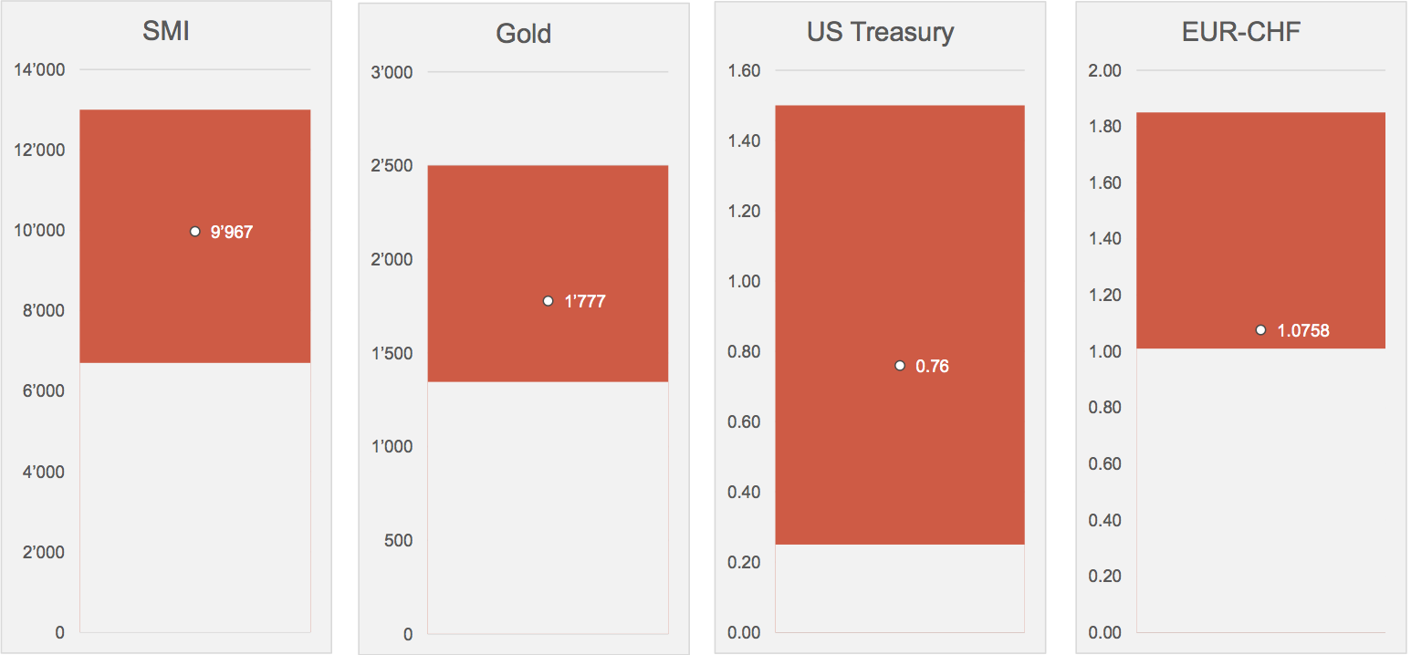 Bis Jahresmitte erwarten die befragten Vermögensverwalter (vgl. Grafik oben) einen SMI auf 9'967, einen Goldpreis von 1'777 Dollar pro Unze, 10-jährige US-Staatsanleihen mit einer Rendite von 0,76 Prozent sowie einen Euro-/Franken-Kurs auf 1.076.