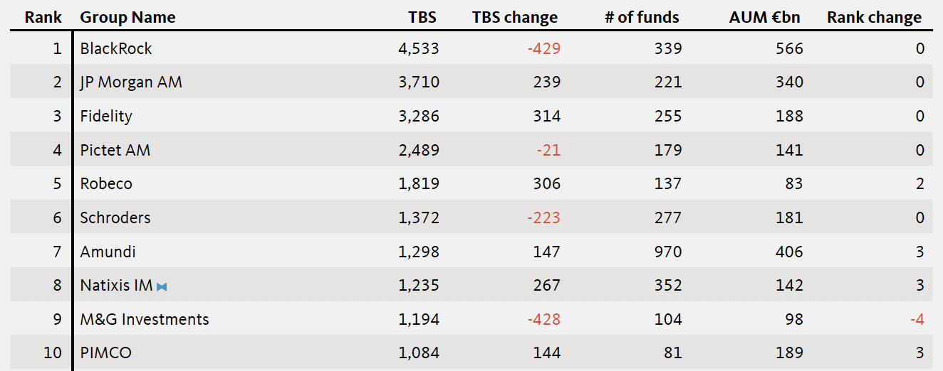 Daraus errechnet der «Fund Buyer Focus» den sogenannten Total Brand Score (TBS), auf dem die Rangliste beruht. International rangiert Blackrock vor J.P. Morgan Asset Management und Fidelity an erster Stelle. Für die Schweiz sicherlich erfreulich ist der vierte Platz, den Pictet Asset Management belegt, und dies erst noch mit einem deutlichen Abstand zu den nachfolgenden Fondshäusern Robeco, Schroders, Amundi, Natixis Investment Managers, M&G und Pimco, um die ersten zehn Rangierungen zu nennen.