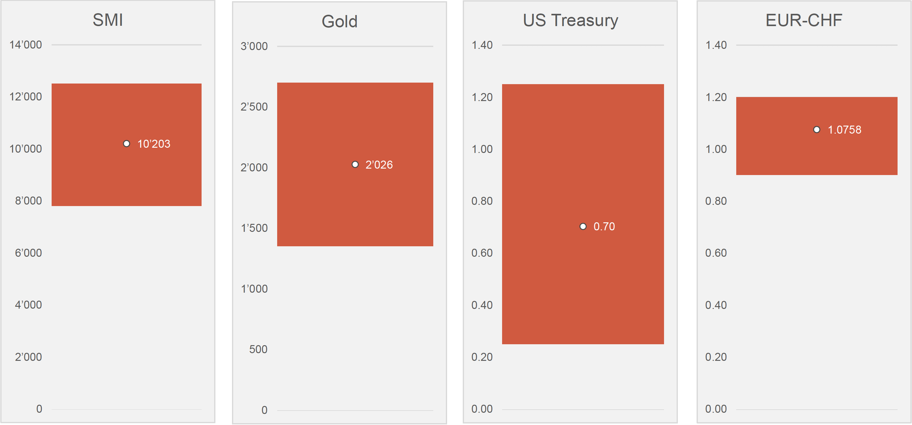Bis Jahresende erwarten die befragten Vermögensverwalter (vgl. Grafik oben) einen SMI auf 10'203, einen Goldpreis von 2'026 Dollar pro Unze, 10-jährige US-Staatsanleihen mit einer Rendite von 0,70 Prozent sowie einen Euro-/Franken-Kurs auf 1.076.