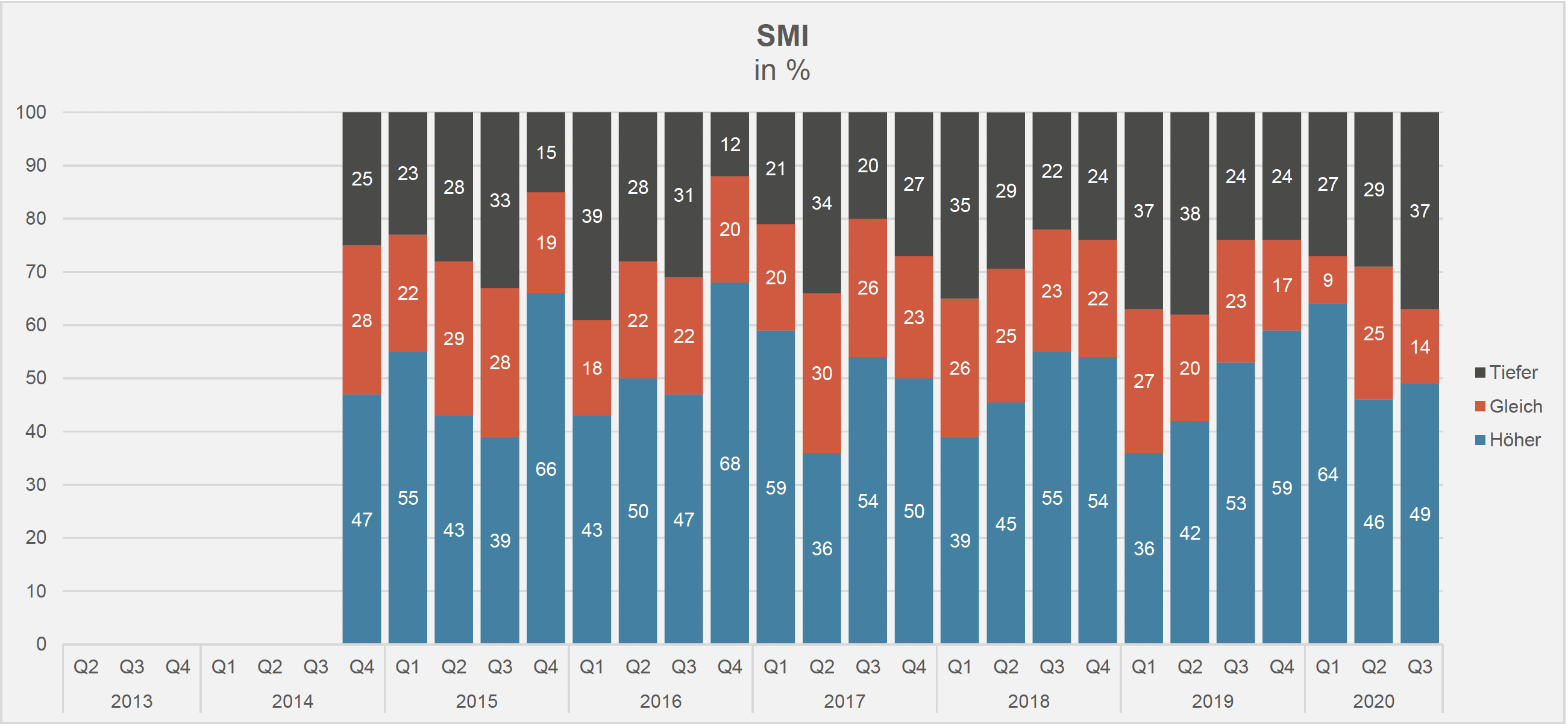 So rechnet fast die Hälfte (49 Prozent) der befragten Marktteilnehmer mit weiter steigenden Kursen vom Swiss Market Index (SMI); im Vorquartal waren es 46 Prozent gewesen. Exakt 14 Prozent (Vorquartal: 25 Prozent) gehen von gleich bleibenden Kursen aus, während 37 Prozent (Vorquartal: 29 Prozent) mit tieferen Bewertungen rechnen (vgl. nachfolgende Grafik). Beim EuroStoxx 50 sowie beim S&P 500 fällt die Einschätzung weniger positiv aus.