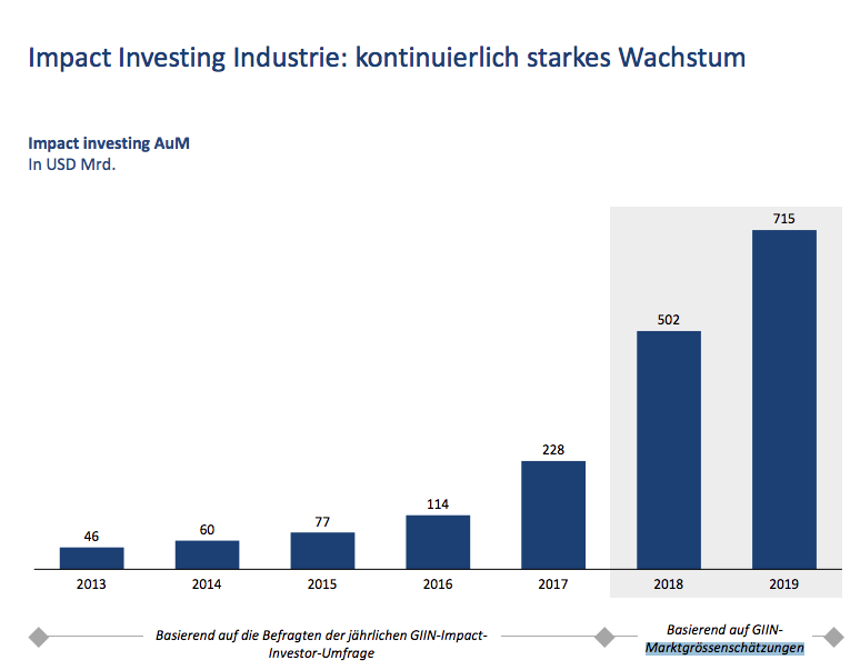 Die Zahlen stützen Fanconis Behauptung: Laut Daten des Global Impact Investing Network (GIIN), quasi der Branchenvereinigung der Impact Investoren, beliefen sich die gesamten verwalteten Vermögen in diesem Bereich 2013 noch bei 43 Milliarden Dollar und 2017 bereits bei 228 Milliarden Dollar. 2018 hat sich die Summe mit 502 Milliarden mehr als verdoppelt und belief sich im letzten Jahr laut Schätzungen von GIIN auf stolze 715 Milliarden Dollar.