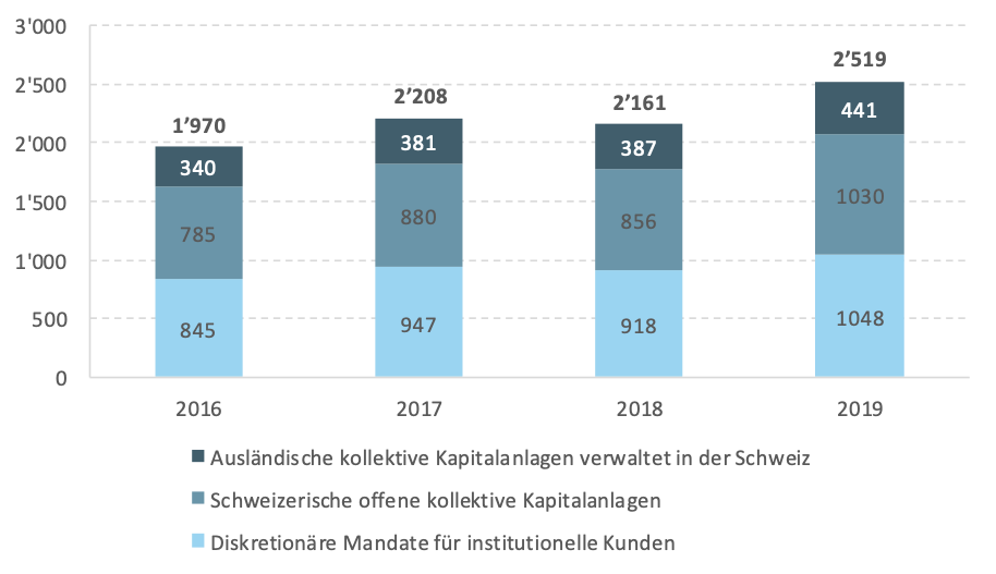 Exakt 2'519 Milliarden Franken – dies ist die Summe an Vermögen, die von Asset Managern in der Schweiz per Ende 2019 verwaltet wurde. Mit einem Wachstum von 16,5 Prozent gegenüber dem Vorjahr, was in absoluten Zahlen eine Zunahme von satten 358 Milliarden Franken entspricht, geht das vergangene Jahr für die Schweizer Asset-Management-Branche als eines der besten in die Geschichte ein.