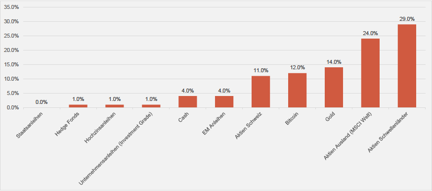 Ein Blick auf die durchschnittliche Asset-Allokation der befragten Akteure zeigt, dass sie gegenüber dem Vorquartal ihre Liquidität von 16,3 Prozent auf 14,2 Prozent abgebaut haben, was zu Gunsten von Unternehmensanleihen (von 23,7 Prozent auf 24 Prozent) sowie von Gold (von 6,7 Prozent auf 8 Prozent) ging. Unverändert blieb per Jahresanfang der Aktienanteil und zwar bei 45 Prozent (vgl. nachstehende Grafik).