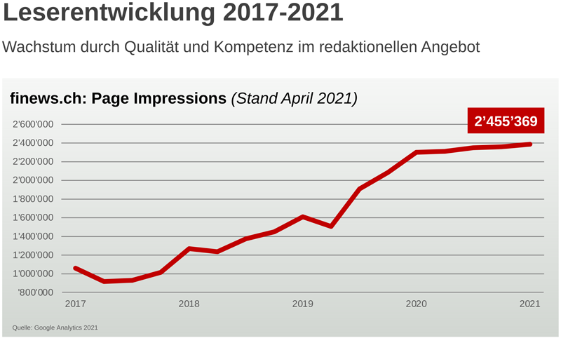 Diese mehr als 700'000 Leserinnen und Leser finden grossen Gefallen an den gebotenen News. In den meisten Fällen klicken sie auf mehrere Artikel. Das führt dazu, dass finews.ch in den vergangenen zwölf Monaten auch seine Page Impressions signifikant auf mehr als 2,45 Millionen Seitenzugriffe pro Monat steigern konnte.