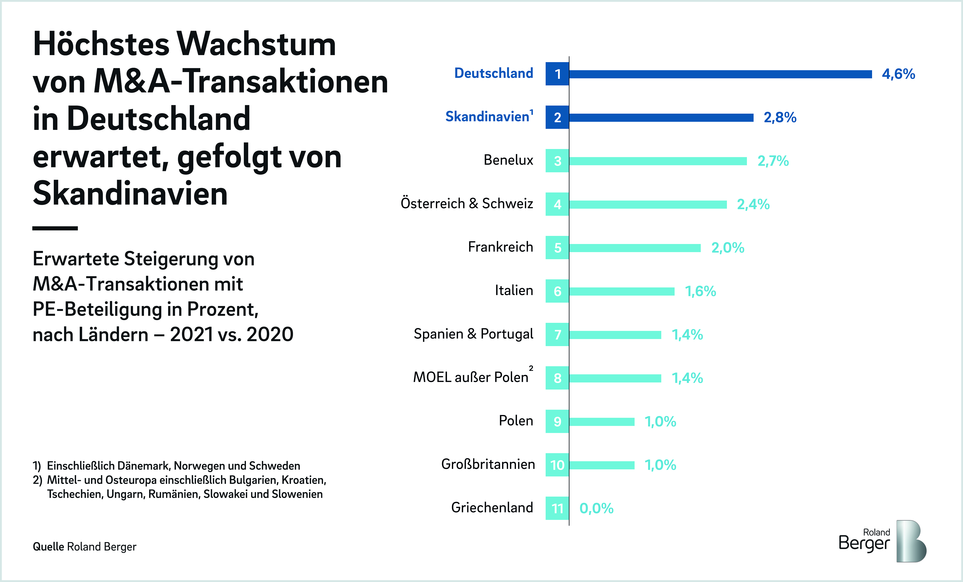 Europaweit noch stärker als in der Schweiz sollen M&A-Transaktionen mit Private-Equity-Beteiligungen in Deutschland (5 Prozent), den Benelux-Staaten und Skandinavien zulegen (jeweils 3 Prozent). Österreich zieht mit den 2,4 Prozent der Schweiz gleich.