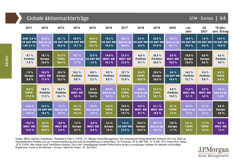 Den «Guide to the Markets» hat J.P. Morgan Asset Management entwickelt, um Kundenberater und professionelle Anleger zu unterstützen, immer auf dem neuesten Stand der Märkte zu sein.