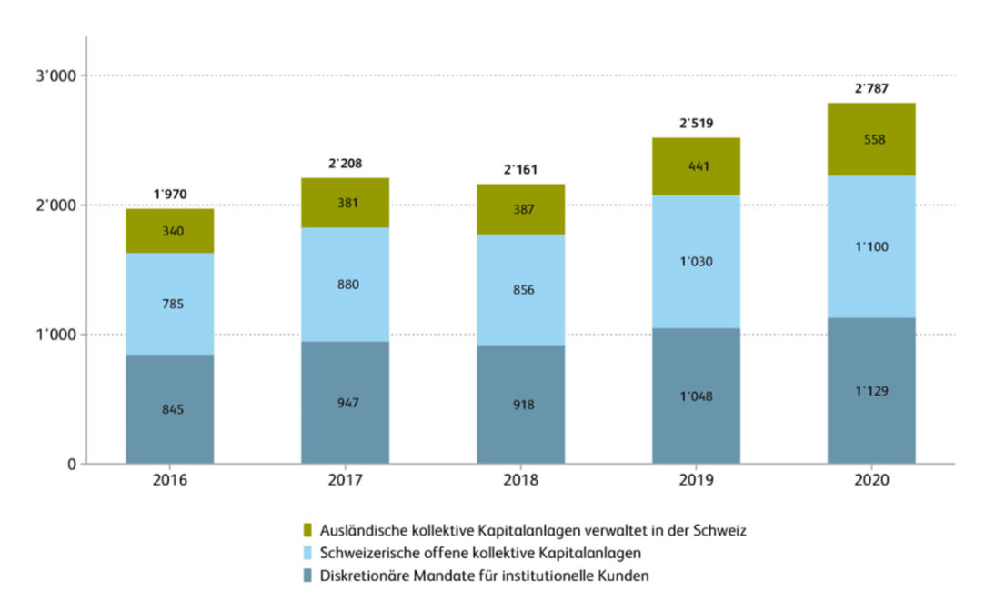 Dass die Schweiz als Standort für Vermögensverwaltung im vergangenen Jahr erfolgreich war, liess sich bereits in den Jahreszahlen der meisten Institute ablesen. Nun gewährt die neue «Schweizer Asset-Management-Studie 2021» eine Gesamtsicht: Die Branche der Asset Manager wuchs 2020 insgesamt um 10,6 Prozent und erreichte gemessen an den im Inland verwalteten Vermögen einen neuen Höchststand. Per Ende Jahr wurden hierzulande 2'787 Milliarden Franken verwaltet. Das ist rund fünfmal so viel wie das gesamte BIP der Schweiz.