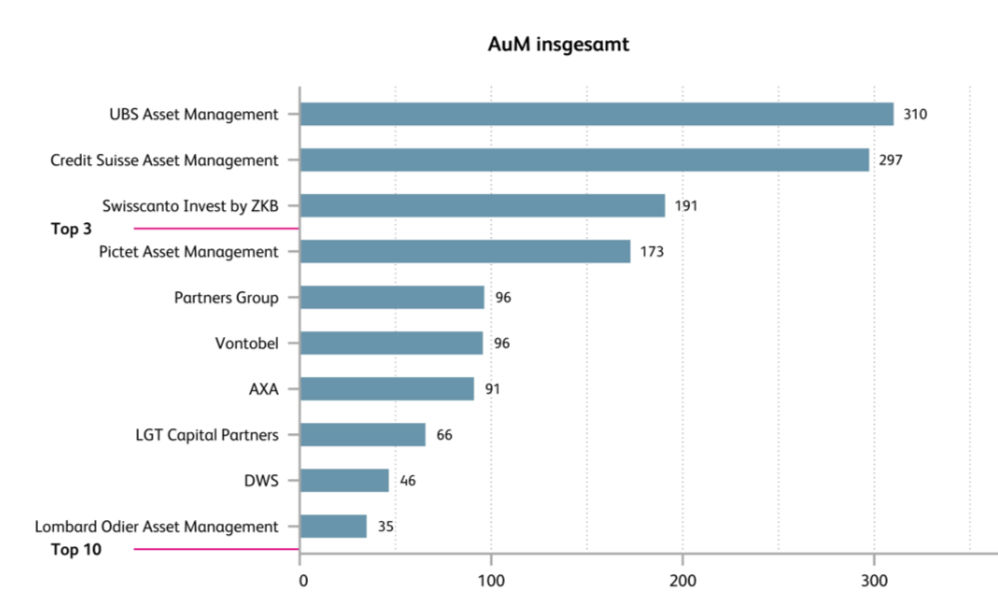 Dahinter folgen auf den Plätzen 5 bis 10 Partners Group, Vontobel, der Investmentarm des Versicherers Axa, LGT Capital, die deutsche DWS und die Genfer Privatbank Lombard Odier (siehe Grafik). Die zehn grössten machen dabei zusammen mehr als die Hälfte der gesamten verwalteten Vermögen aus.